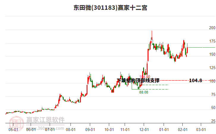 2月13日股價處于前期2025年11月24日形成的下跌結(jié)構(gòu)頂部線104.8上方,近期股價在此位置呈現(xiàn)震蕩走勢,震蕩區(qū)間為181.4-148.26,今日收盤價157.19,小幅下跌4.89%。依據(jù)贏家十二宮多空能量守恒規(guī)則,下跌結(jié)構(gòu)頂部線是多空能量轉(zhuǎn)換的關(guān)鍵位置,多方能量已連續(xù)釋放,空方能量不斷聚集。當前股價若能站穩(wěn)下跌結(jié)構(gòu)頂部線104.8,多方有望再一次發(fā)動上攻,若跌破下跌結(jié)構(gòu)頂部線,則股價將會向下警戒線位置附近尋找新的平衡位。
