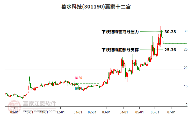 周二301190善水科技最高價25.38上穿了贏家極反通道工具藍色外軌線,受到藍色外軌線強力壓制,最終收盤停留在在藍色外軌線與生命線上方的強勢通道區(qū)域。301190善水科技近10個交易日漲幅2.09%