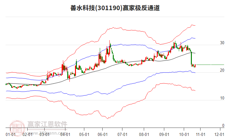 依據(jù)贏家江恩系統(tǒng)趨勢工具極反通道分析判斷善水科技301190運行在生命線以下弱勢區(qū)域,根據(jù)規(guī)則該股短線輕倉參與,股價跌至弱勢外軌線后波段再結(jié)合其它工具信號建倉。應(yīng)用口訣是:生命線上強勢走,生命線下難抬頭;紅黃兩條外軌線,壓力支撐顯勢頭。