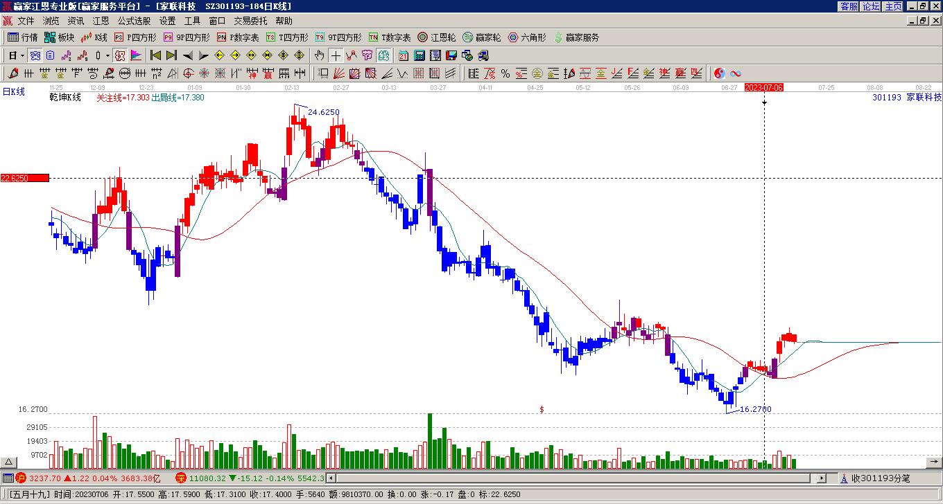 家聯(lián)科技處于贏(yíng)家江恩多頭次主線(xiàn)形態(tài),從1月23日形成頂分型后持續(xù)下跌,重心下移,今日跌破前低形成短期初次筑頂信號(hào),短期多頭趨勢(shì)已被破壞,中長(zhǎng)期多頭趨勢(shì)依舊保持。家聯(lián)科技截至目前K線(xiàn)為下影小陰線(xiàn),這種K