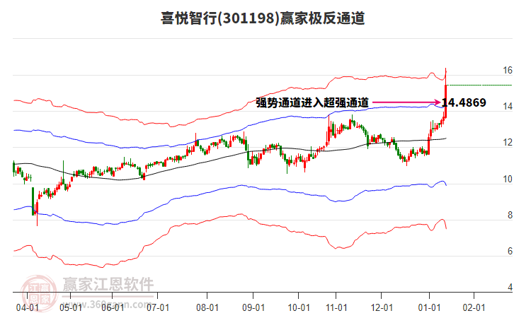 1月14日喜悅智行301198最高價(jià)16.38挑戰(zhàn)了贏家極反通道工具上方紅色外軌線(xiàn),受到上方紅色外軌線(xiàn)強(qiáng)力壓制,最終收盤(pán)停留在在上方紅色外軌線(xiàn)與藍(lán)色外軌線(xiàn)上方的超強(qiáng)通道區(qū)域。喜悅智行301198近10