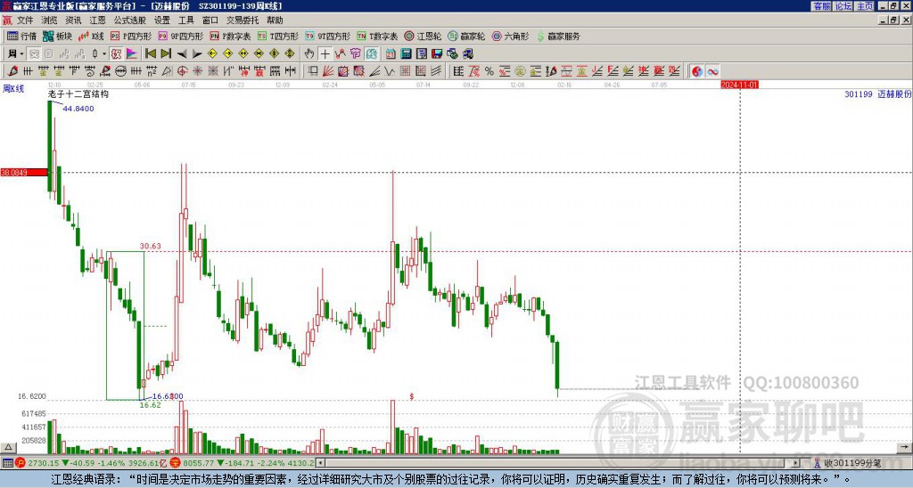301199邁赫股份處于贏(yíng)家江恩多頭中期回調(diào)形態(tài),12月25日發(fā)出江恩筑底信號(hào)后,經(jīng)過(guò)34日,今日形成短期筑頂信號(hào),短期多頭趨勢(shì)已被破壞,中期多頭反彈趨勢(shì)延續(xù),但長(zhǎng)期處于回調(diào)中。邁赫股份今日跳空低開(kāi),