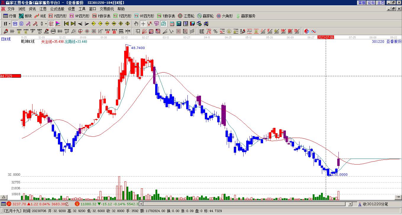 依據(jù)贏家江恩乾坤K線工具展示,本周K線以陰線收盤,目前股價處于藍色區(qū)域,位于關注線下方,關注線對當前股價形成壓制,短期看空。后市如若股價有效突破空頭出局線,則有望形成短期反彈(如不能突破空頭出局線,后市將延續(xù)下跌趨勢)。如跌破近期低點,后市將會進一步下探。