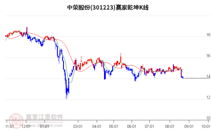 301223中榮股份處于贏家江恩多頭主線形態(tài),12月4日發(fā)出江恩筑頂信號后,經(jīng)過32日,今日再次發(fā)出江恩底分型并發(fā)出江恩筑底信號,中長期多頭趨勢依舊保持。中榮股份今日低開,截止目前微漲1.36%,K線