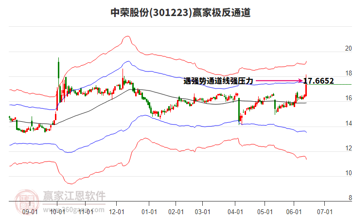依據(jù)贏家江恩系統(tǒng)趨勢工具極反通道分析判斷中榮股份301223運(yùn)行在生命線以下弱勢區(qū)域,根據(jù)規(guī)則該股短線輕倉參與,股價(jià)跌至弱勢外軌線后波段再結(jié)合其它工具信號建倉。應(yīng)用口訣是:生命線上強(qiáng)勢走,生命線下難抬頭;紅黃兩條外軌線,壓力支撐顯勢頭。