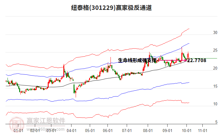 依據(jù)贏家江恩系統(tǒng)趨勢工具極反通道分析判斷紐泰格301229運行在生命線以下弱勢區(qū)域,根據(jù)規(guī)則該股短線輕倉參與,股價跌至弱勢外軌線后波段再結(jié)合其它工具信號建倉。應(yīng)用口訣是:生命線上強勢走,生命線下難抬頭;紅黃兩條外軌線,壓力支撐顯勢頭。