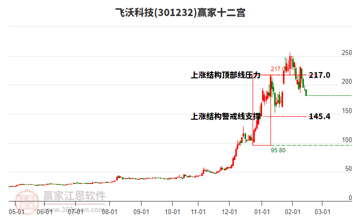 301232飛沃科技低開收穿頭破腳大陽線,當天收盤價為215.0