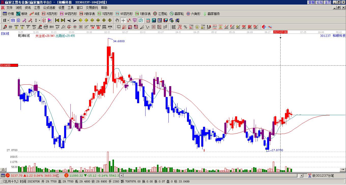 301237和順科技處于贏家江恩多頭次主線形態(tài),12月16日發(fā)出江恩筑底信號后,經(jīng)過42日,今日形成短期筑頂信號,短期多頭趨勢已被破壞,中長期多頭趨勢依舊保持。和順科技截至目前K線為上下影小陰線,在經(jīng)