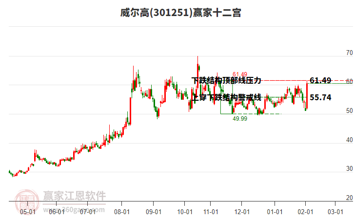 2月13日股價(jià)下穿前期2025年11月21日形成的下跌結(jié)構(gòu)頂部線,以上影小陰線收盤,小幅下跌2.62%,近期高點(diǎn)為2月10日,跌至今日,持續(xù)3天,跌幅8.8%。依據(jù)贏家十二宮多空能量守恒規(guī)則,當(dāng)前股價(jià)下跌若不能收復(fù)下跌結(jié)構(gòu)頂部線61.49,多方能量持續(xù)萎縮,空方動能充足,將會進(jìn)一步下探警戒線55.74,若能再次收復(fù)下跌結(jié)構(gòu)頂部線,有望再度展開上攻。