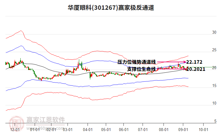 依據(jù)贏家江恩系統(tǒng)趨勢工具極反通道分析判斷華廈眼科301267運行在生命線以下弱勢區(qū)域,根據(jù)規(guī)則該股短線輕倉參與,股價跌至弱勢外軌線后波段再結(jié)合其它工具信號建倉。應(yīng)用口訣是:生命線上強勢走,生命線下難抬頭;紅黃兩條外軌線,壓力支撐顯勢頭。