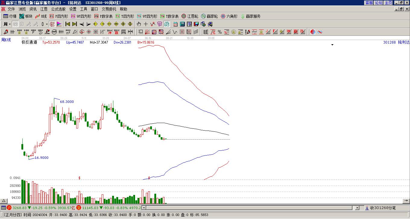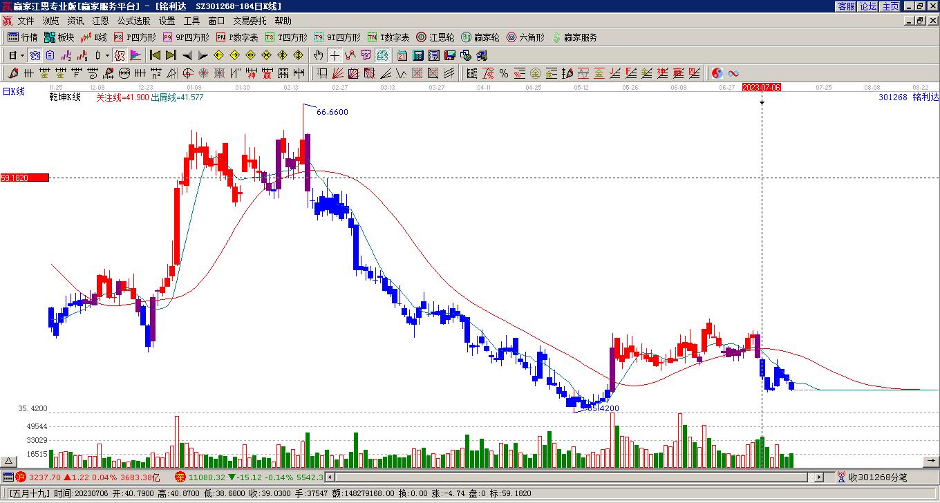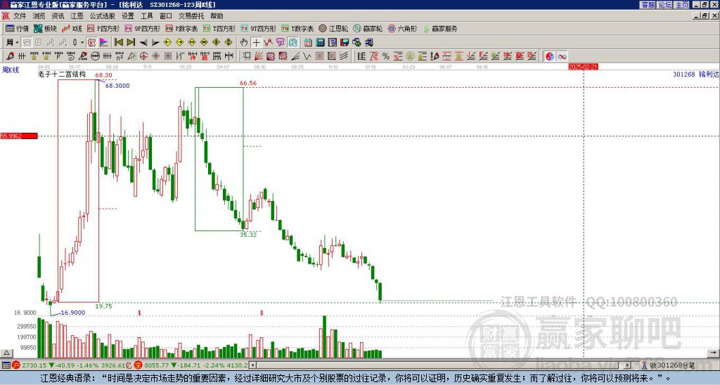 銘利達(301268)處于贏家江恩多頭中期回調(diào)形態(tài),今日重心持續(xù)下移,短期延續(xù)下跌趨勢,6月18日發(fā)出中期江恩筑底信號后,經(jīng)過229日,今日形成中期筑頂信號,若持續(xù)下跌,觸發(fā)長期筑頂信號,銘利達(30
