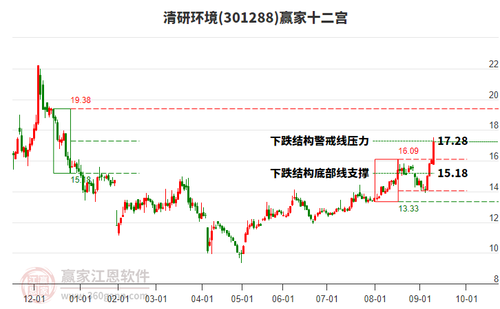 依據(jù)贏家江恩系統(tǒng)趨勢工具極反通道分析判斷清研環(huán)境301288運行在生命線以下弱勢區(qū)域,根據(jù)規(guī)則該股短線輕倉參與,股價跌至弱勢外軌線后波段再結(jié)合其它工具信號建倉。應(yīng)用口訣是:生命線上強勢走,生命線下難抬頭;紅黃兩條外軌線,壓力支撐顯勢頭。