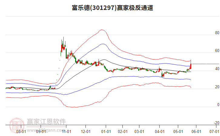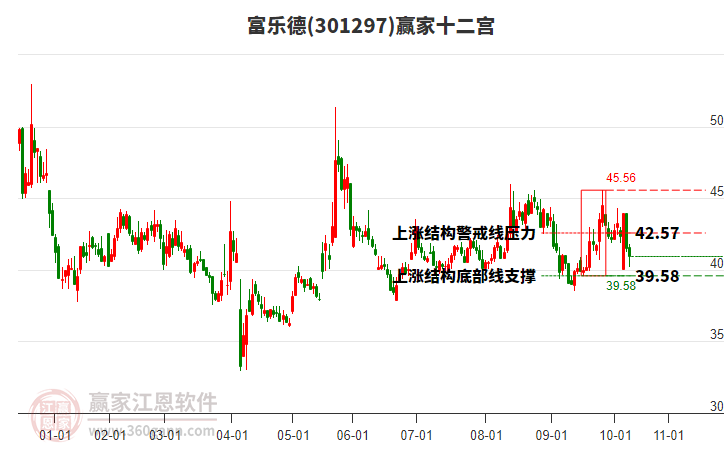 依據(jù)贏家江恩系統(tǒng)趨勢工具極反通道分析判斷富樂德301297運行在生命線以下弱勢區(qū)域,根據(jù)規(guī)則該股短線輕倉參與,股價跌至弱勢外軌線后波段再結(jié)合其它工具信號建倉。應(yīng)用口訣是:生命線上強勢走,生命線下難抬頭;紅黃兩條外軌線,壓力支撐顯勢頭。