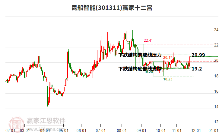 昆船智能(301311)處于贏家江恩空頭主線形態(tài),從11月24日形成頂分型后持續(xù)下跌,今日形成短期初次筑頂信號(hào),短期多頭趨勢(shì)已被破壞,中長(zhǎng)線均在空頭下跌趨勢(shì)中。昆船智能近期連續(xù)三個(gè)交易日下跌,形成黑三