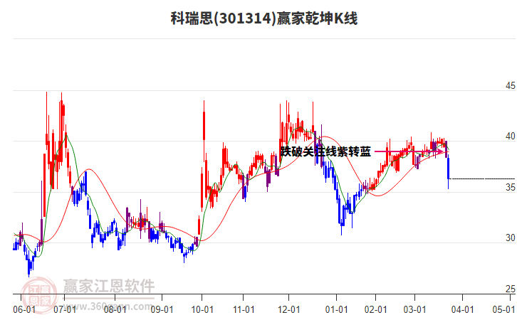 301314科瑞思上漲遇阻 受藍(lán)色外軌線壓制 以上影中陽線收盤