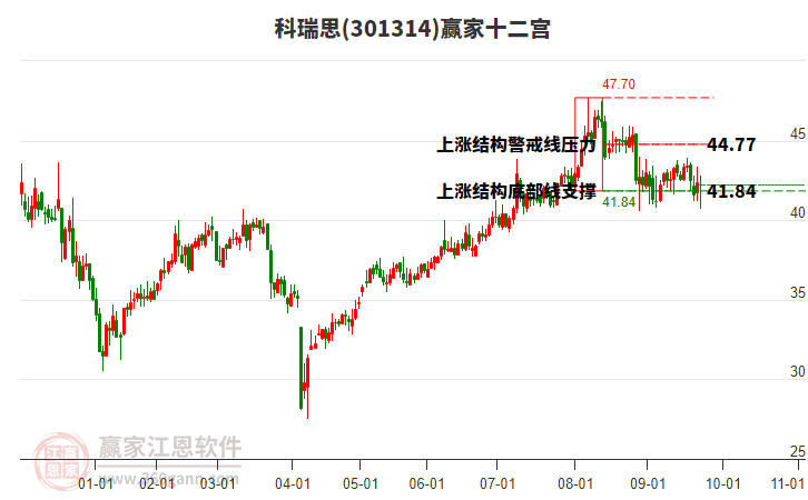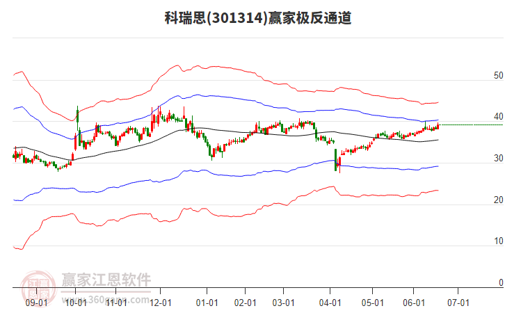 1月5日科瑞思最高價44.77上穿了贏家極反通道工具生命線,受到生命線強(qiáng)力壓制,最終收盤停留在在生命線與藍(lán)色下軌線上方的弱勢通道區(qū)域??迫鹚冀?0個交易日漲幅6.28%。