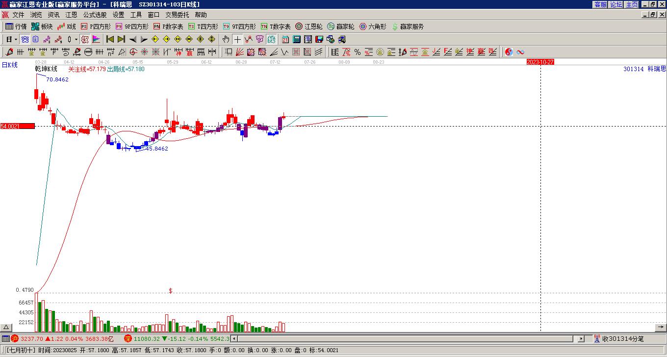 301314科瑞思上漲遇阻 受藍(lán)色外軌線壓制 以上影中陽線收盤