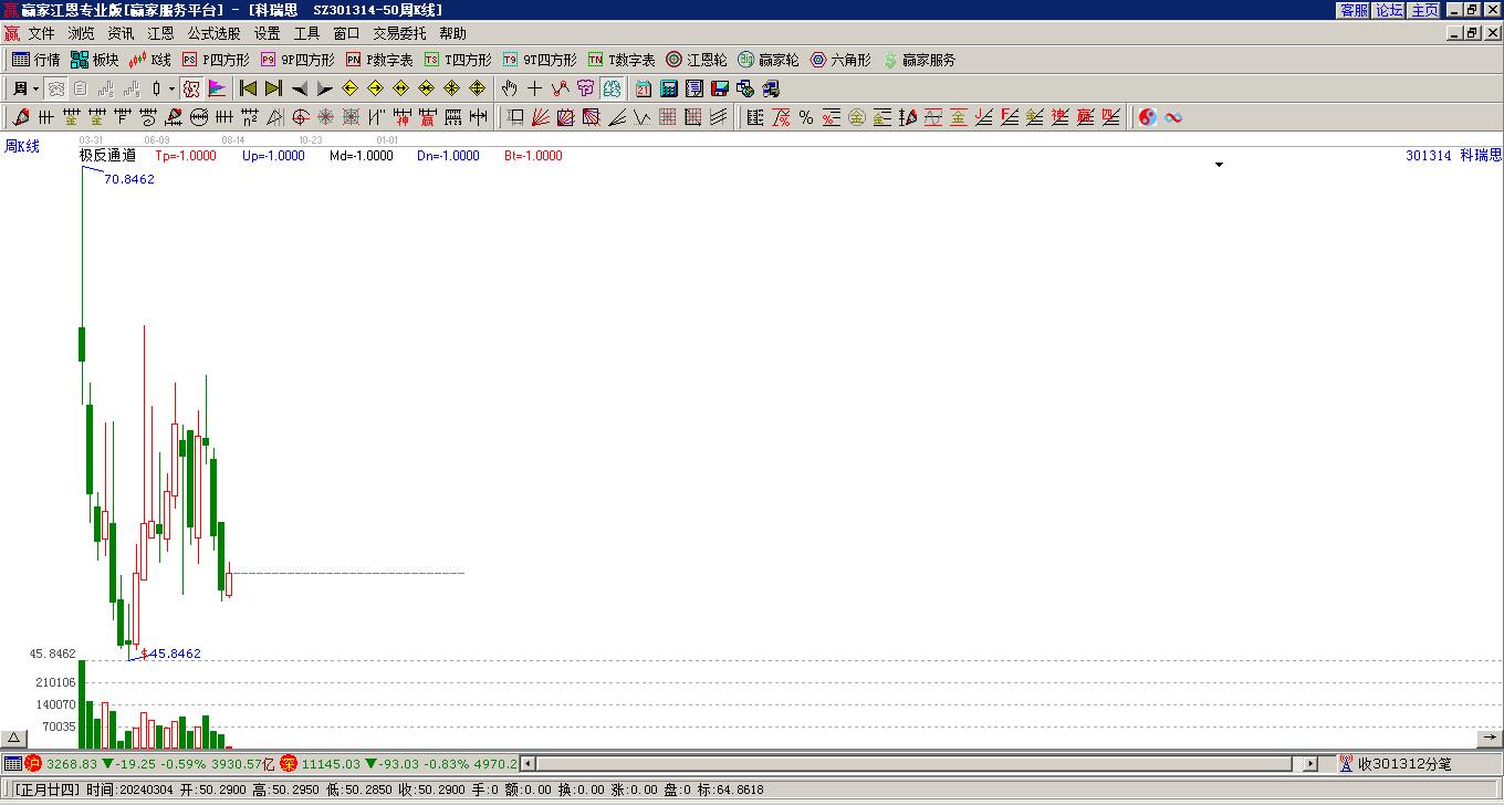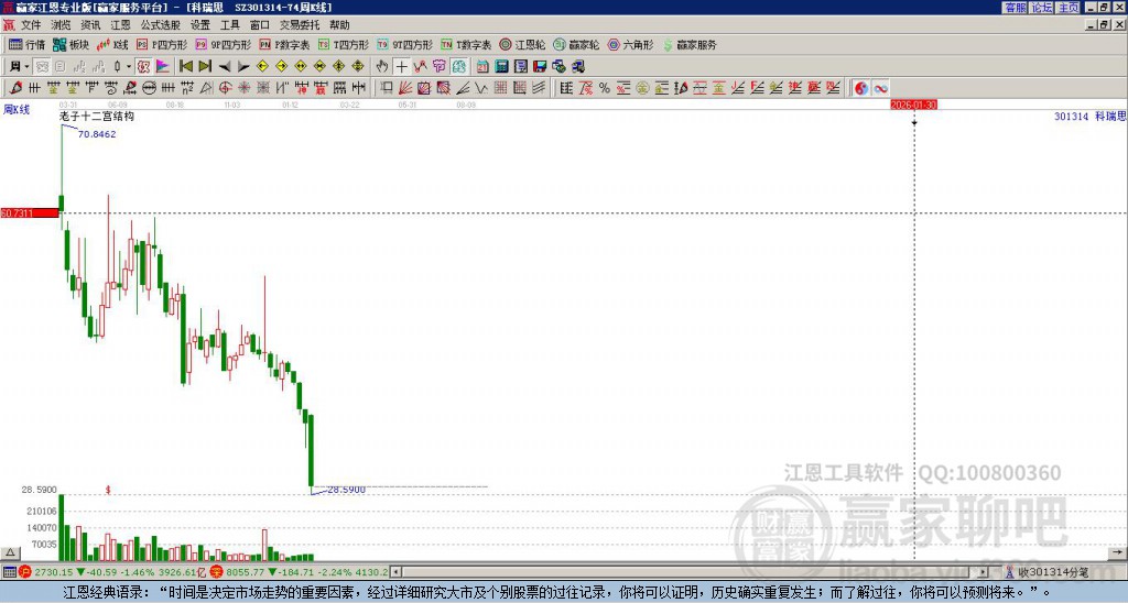 301314科瑞思處于贏家江恩多頭次主線形態(tài),從12月9日形成頂分型后持續(xù)下跌,重心下移,今日跌破前低形成短期初次筑頂信號,短期多頭趨勢已被破壞,中長期多頭趨勢依舊保持。科瑞思今日跳空低開,截止目前K