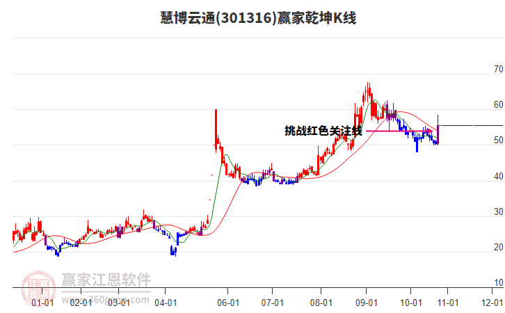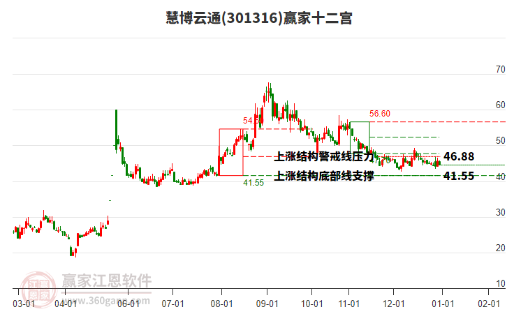 依據(jù)贏家江恩系統(tǒng)趨勢工具極反通道分析判斷慧博云通301316運行在生命線以上強勢區(qū)域,根據(jù)規(guī)則該股可短線、波段結(jié)合操作;結(jié)合物極必反的原理通過分鐘圖做盤中差價,應(yīng)用口訣是:生命線上強勢走,生命線下難抬頭;紅黃兩條外軌線,壓力支撐顯勢頭。
