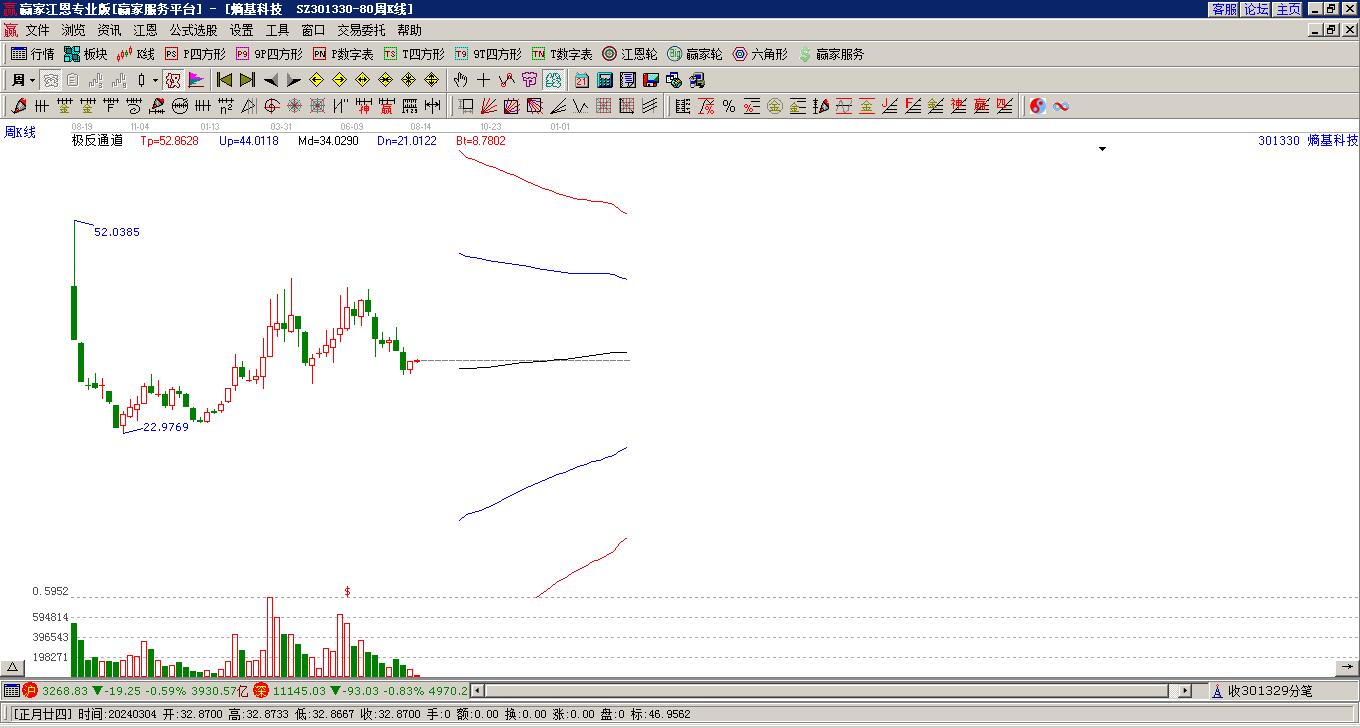 依據(jù)贏家江恩極反通道趨勢(shì)工具展示,本周股價(jià)處于生命線(xiàn)上強(qiáng)勢(shì)通道,本周收盤(pán)價(jià)38.62,自近期通道內(nèi)高點(diǎn)50.5持續(xù)下跌至本周,到達(dá)生命線(xiàn)28.6528點(diǎn)上方,短期關(guān)注此線(xiàn)支撐,如支撐不破,保持在強(qiáng)勢(shì)通道內(nèi),波段繼續(xù)看多,有望再次挑戰(zhàn)藍(lán)色上軌線(xiàn)。若跌破生命線(xiàn)28.6528,進(jìn)入弱勢(shì)通道,打開(kāi)下跌空間。