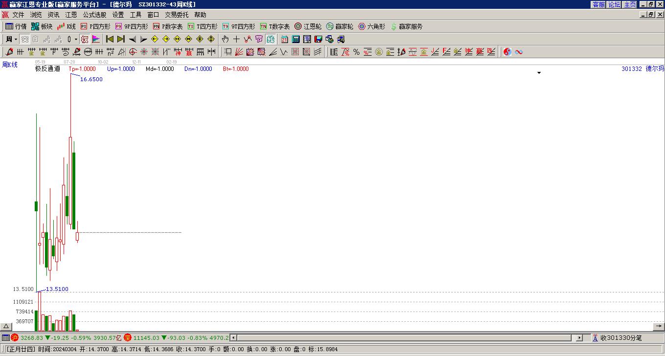 德爾瑪(301332)處于贏家江恩空頭主線形態(tài),從11月14日形成頂分型后持續(xù)下跌,今日形成短期初次筑頂信號,短期多頭趨勢已被破壞,中長線均在空頭下跌趨勢中。德爾瑪今日跳空低開,截止目前K線呈現(xiàn)上下影