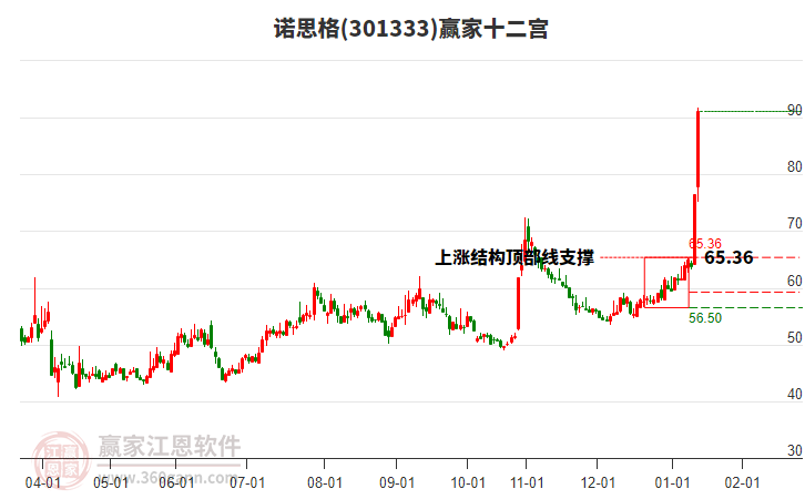 依據(jù)贏家江恩系統(tǒng)趨勢工具極反通道分析判斷諾思格301333運行在生命線以下弱勢區(qū)域,根據(jù)規(guī)則該股短線輕倉參與,股價跌至弱勢外軌線后波段再結合其它工具信號建倉。應用口訣是:生命線上強勢走,生命線下難抬頭;紅黃兩條外軌線,壓力支撐顯勢頭。