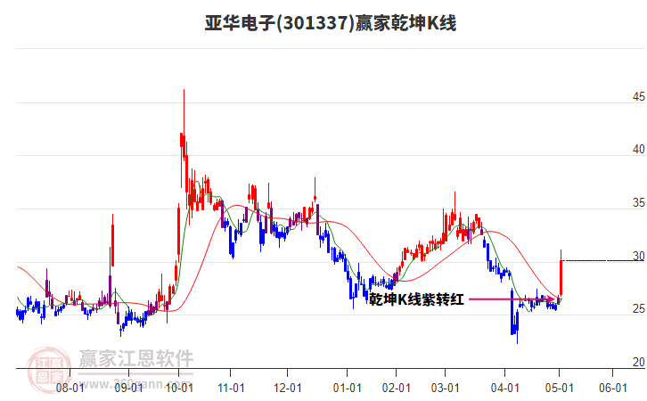 依據贏家江恩系統(tǒng)趨勢工具極反通道分析判斷亞華電子301337運行在生命線以下弱勢區(qū)域,根據規(guī)則該股短線輕倉參與,股價跌至弱勢外軌線后波段再結合其它工具信號建倉。應用口訣是:生命線上強勢走,生命線下難抬頭;紅黃兩條外軌線,壓力支撐顯勢頭。