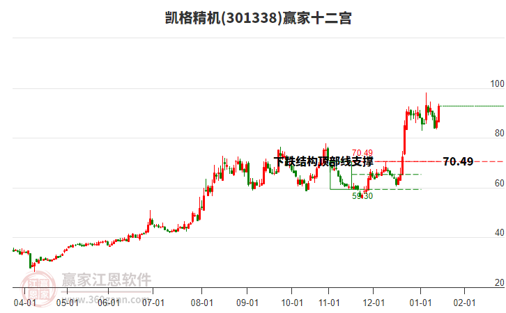 依據(jù)贏家江恩系統(tǒng)趨勢工具極反通道分析判斷凱格精機(jī)301338運(yùn)行在生命線以下弱勢區(qū)域,根據(jù)規(guī)則該股短線輕倉參與,股價(jià)跌至弱勢外軌線后波段再結(jié)合其它工具信號(hào)建倉。應(yīng)用口訣是:生命線上強(qiáng)勢走,生命線下難抬頭;紅黃兩條外軌線,壓力支撐顯勢頭。