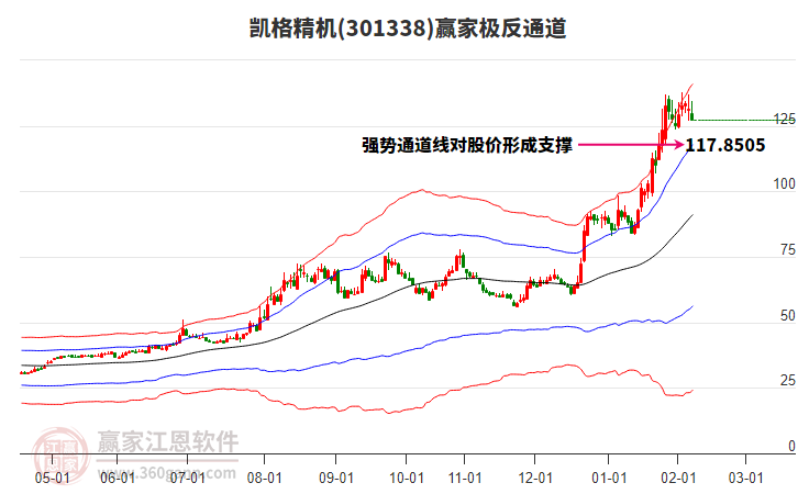 今天凱格精機(jī)301338最高價(jià)133.97上穿了贏家極反通道工具上方紅色外軌線,受到上方紅色外軌線強(qiáng)力壓制,最終收盤停留在在上方紅色外軌線與藍(lán)色外軌線上方的超強(qiáng)通道區(qū)域。凱格精機(jī)301338近10個(gè)交