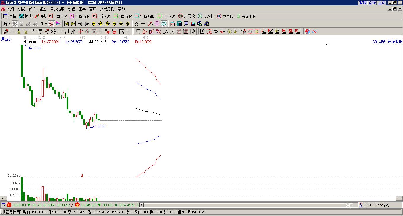 天振股份(301356)處于贏家江恩多頭中期回調形態(tài),12月9日發(fā)出江恩筑底信號后,經(jīng)過43日,今日形成短期筑頂信號,短期多頭趨勢已被破壞,中期多頭反彈趨勢延續(xù),但長期處于回調中。天振股份今日跳空低開