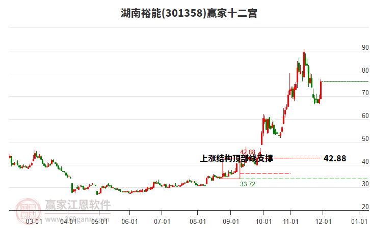 湖南裕能(301358)處于贏家江恩多頭次主線形態(tài),12月26日發(fā)出江恩筑底信號(hào)后,經(jīng)過(guò)13日,今日形成短期筑頂信號(hào),短期多頭趨勢(shì)已被破壞,中長(zhǎng)期多頭趨勢(shì)依舊保持。湖南裕能今日跳空低開(kāi),截止目前K線呈