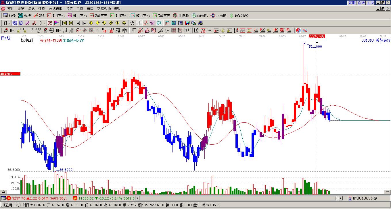 美好醫(yī)療(301363)處于贏家江恩多頭次主線形態(tài),12月18日發(fā)出江恩筑底信號后,經(jīng)過39日,今日形成短期筑頂信號,短期多頭趨勢已被破壞,中期雖然處于回調(diào)中,但長期多頭趨勢延續(xù)。美好醫(yī)療今日雖高開,