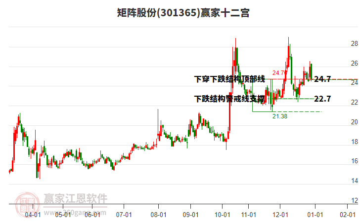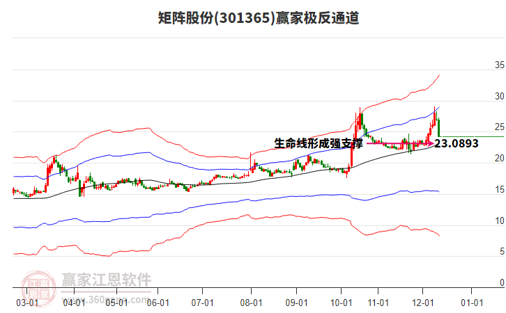 依據(jù)贏家江恩系統(tǒng)趨勢工具極反通道分析判斷矩陣股份301365運行在生命線以下弱勢區(qū)域,根據(jù)規(guī)則該股短線輕倉參與,股價跌至弱勢外軌線后波段再結(jié)合其它工具信號建倉。應(yīng)用口訣是:生命線上強勢走,生命線下難抬頭;紅黃兩條外軌線,壓力支撐顯勢頭。