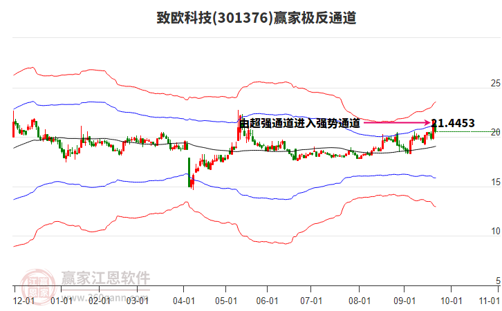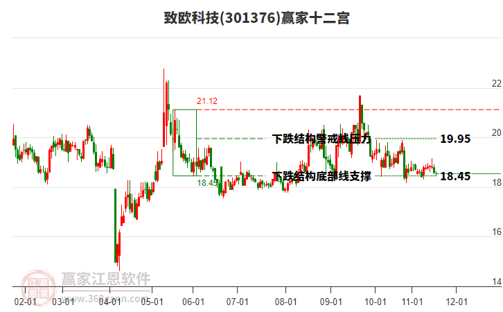 依據(jù)贏家江恩系統(tǒng)趨勢工具極反通道分析判斷致歐科技301376運行在生命線以下弱勢區(qū)域,根據(jù)規(guī)則該股短線輕倉參與,股價跌至弱勢外軌線后波段再結(jié)合其它工具信號建倉。應(yīng)用口訣是:生命線上強勢走,生命線下難抬頭;紅黃兩條外軌線,壓力支撐顯勢頭。