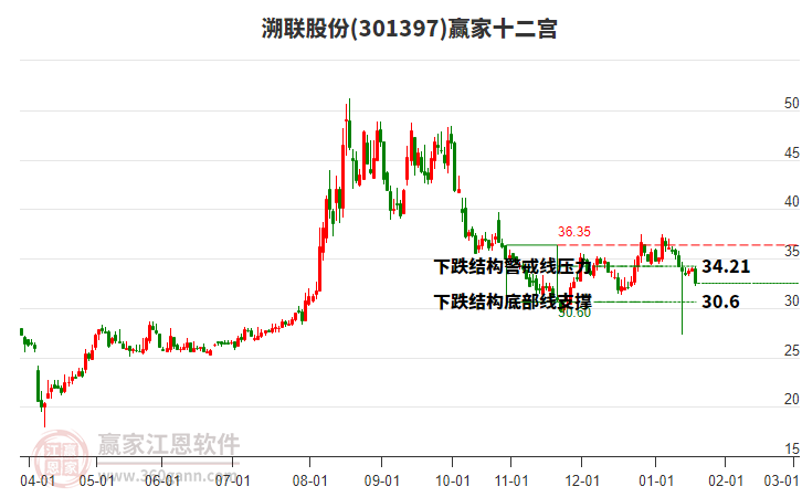 當(dāng)前股價位于前期2026年1月22日形成的下跌結(jié)構(gòu)頂部線35.97與警戒線31.66之間,該股自近期低點(diǎn)29.9,漲至今日32.14,共上漲2.24元,漲幅7.49%。依據(jù)贏家十二宮多空能量守恒規(guī)則,下跌結(jié)構(gòu)警戒線是多空能量平衡爭奪點(diǎn),突破或跌破往往意味著平衡打破。當(dāng)前股價若能站穩(wěn)警戒線位置,多方能量有望主導(dǎo)上攻,向上頂部線位置尋找多空能量平衡位。如股價不能有效站穩(wěn)警戒線,則空方能量主導(dǎo)下探,向底部線附近尋找新的多空能量平衡位。