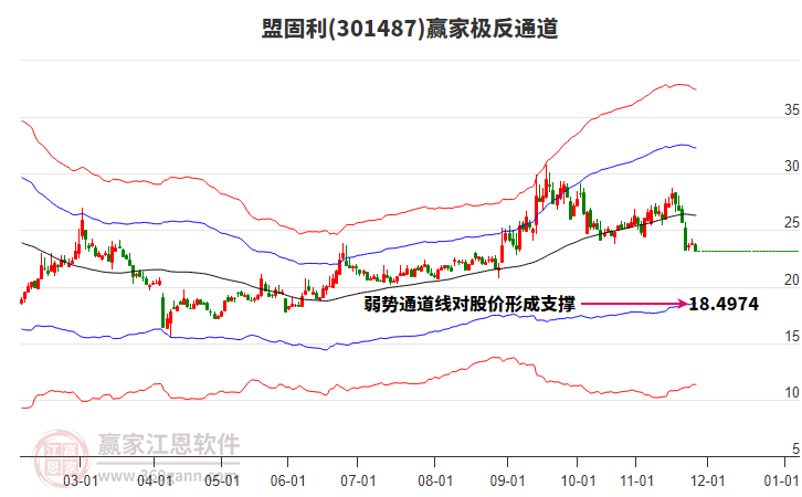 依據(jù)贏家江恩系統(tǒng)趨勢(shì)工具極反通道分析判斷盟固利301487運(yùn)行在生命線以下弱勢(shì)區(qū)域,根據(jù)規(guī)則該股短線輕倉(cāng)參與,股價(jià)跌至弱勢(shì)外軌線后波段再結(jié)合其它工具信號(hào)建倉(cāng)。應(yīng)用口訣是:生命線上強(qiáng)勢(shì)走,生命線下難抬頭;紅黃兩條外軌線,壓力支撐顯勢(shì)頭。