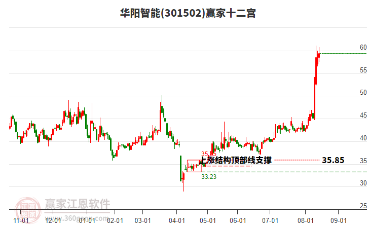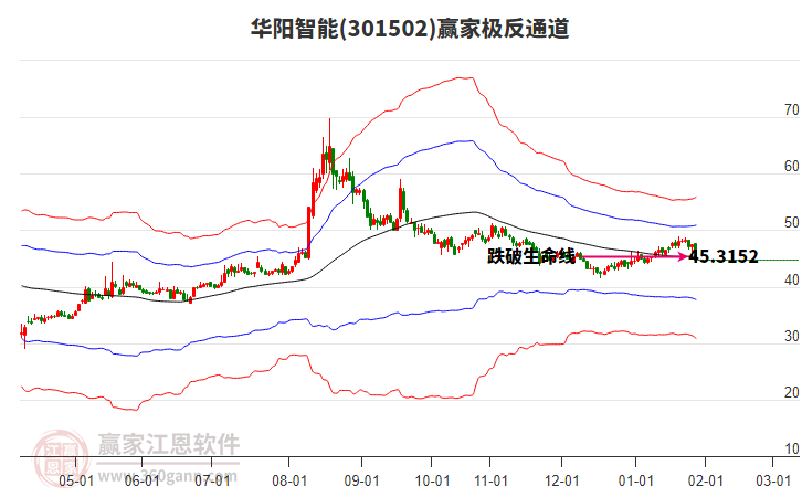 依據(jù)贏家江恩系統(tǒng)趨勢工具極反通道分析判斷華陽智能301502運行在生命線以下弱勢區(qū)域,根據(jù)規(guī)則該股短線輕倉參與,股價跌至弱勢外軌線后波段再結(jié)合其它工具信號建倉。應用口訣是:生命線上強勢走,生命線下難抬頭;紅黃兩條外軌線,壓力支撐顯勢頭。