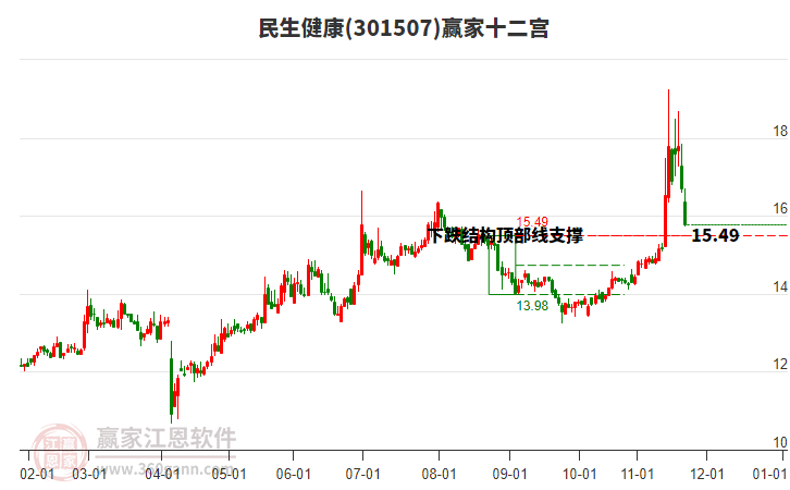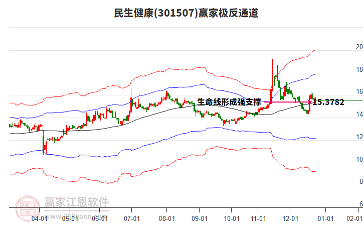 依據(jù)贏家江恩系統(tǒng)趨勢工具極反通道分析判斷民生健康301507運行在生命線以下弱勢區(qū)域,根據(jù)規(guī)則該股短線輕倉參與,股價跌至弱勢外軌線后波段再結(jié)合其它工具信號建倉。應(yīng)用口訣是:生命線上強勢走,生命線下難抬頭;紅黃兩條外軌線,壓力支撐顯勢頭。
