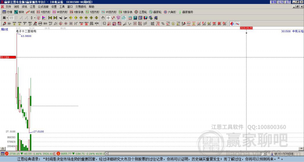301508中機(jī)認(rèn)檢處于贏家江恩多頭次主線形態(tài),從1月22日形成頂分型后持續(xù)下跌,重心下移,今日跌破前低形成短期初次筑頂信號(hào),短期多頭趨勢(shì)已被破壞,中期雖然處于回調(diào)中,但長期多頭趨勢(shì)延續(xù)。中機(jī)認(rèn)檢今日