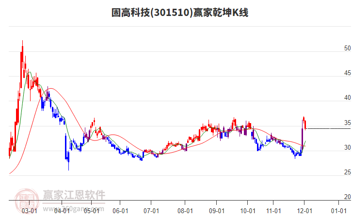 12月30日301510固高科技上穿藍(lán)色外軌線 以穿頭破腳中陽線收盤