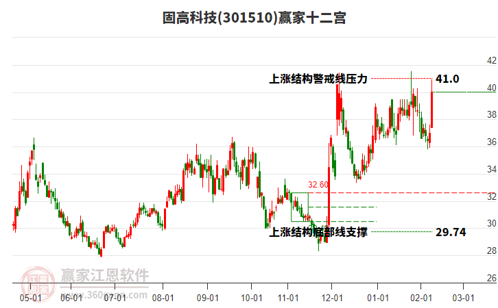 2月13日股價(jià)處在2025年2月26日形成的上漲結(jié)構(gòu)底部線與警戒線之間,今日股價(jià)微跌0.25%,目前處于底部線上方。依據(jù)贏家十二宮多空能量守恒規(guī)則,上漲結(jié)構(gòu)底部線位置是多空能量轉(zhuǎn)換的一個(gè)關(guān)鍵位置。如底部線29.74支撐不破,由多方能量主導(dǎo)上攻,在警戒線41.0尋找多空能量平衡。如跌破底部線,空方動(dòng)能占據(jù)主導(dǎo),打開新的下跌空間。