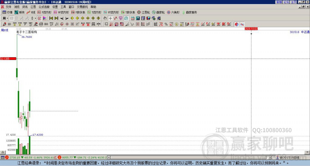 中遠通處于贏家江恩空頭主線形態(tài),今日重心持續(xù)下移,短期延續(xù)下跌趨勢,今日形成中期筑頂信號,注意風險規(guī)避。中遠通今日低開下跌,截止目前K線為上影小陰線,呈下跌走勢。