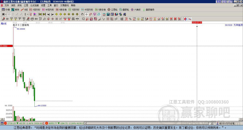 萬(wàn)邦醫(yī)藥(301520)處于贏家江恩多頭次主線形態(tài),1月5日發(fā)出江恩筑底信號(hào)后,經(jīng)過(guò)31日,今日形成短期筑頂信號(hào),短期多頭趨勢(shì)已被破壞,中期雖然處于回調(diào)中,但長(zhǎng)期多頭趨勢(shì)延續(xù)。萬(wàn)邦醫(yī)藥今日雖高開(kāi),但現(xiàn)