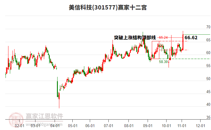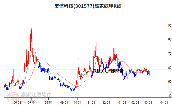 美信科技(301577)處于贏家江恩空頭主線形態(tài),今日重心持續(xù)下移,短期延續(xù)下跌趨勢,從11月4日形成中期頂分型后中期重心持續(xù)下移,今日跌破前低形成初次筑頂信號,注意風(fēng)險規(guī)避。美信科技今日跳空低開,截