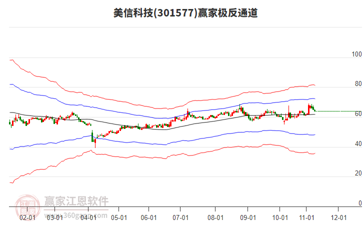依據(jù)贏家江恩系統(tǒng)趨勢工具極反通道分析判斷美信科技301577運行在生命線以下弱勢區(qū)域,根據(jù)規(guī)則該股短線輕倉參與,股價跌至弱勢外軌線后波段再結(jié)合其它工具信號建倉。應(yīng)用口訣是:生命線上強勢走,生命線下難抬頭;紅黃兩條外軌線,壓力支撐顯勢頭。