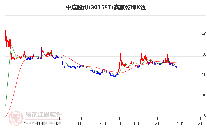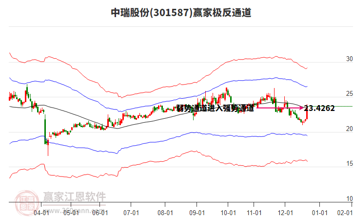 依據(jù)贏家江恩系統(tǒng)趨勢(shì)工具極反通道分析判斷中瑞股份301587運(yùn)行在生命線以下弱勢(shì)區(qū)域,根據(jù)規(guī)則該股短線輕倉(cāng)參與,股價(jià)跌至弱勢(shì)外軌線后波段再結(jié)合其它工具信號(hào)建倉(cāng)。應(yīng)用口訣是:生命線上強(qiáng)勢(shì)走,生命線下難抬頭;紅黃兩條外軌線,壓力支撐顯勢(shì)頭。