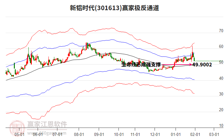 1月7日新鋁時代301613最高價55.53挑戰(zhàn)了贏家極反通道工具藍色外軌線,受到藍色外軌線強力壓制,最終收盤停留在在藍色外軌線與生命線上方的強勢通道區(qū)域。新鋁時代301613近10個交易日漲幅11.