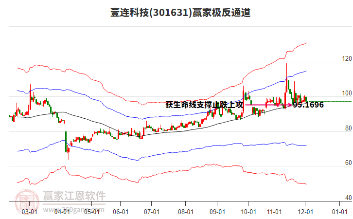 依據(jù)贏家江恩系統(tǒng)趨勢工具極反通道分析判斷壹連科技301631運行在生命線以下弱勢區(qū)域,根據(jù)規(guī)則該股短線輕倉參與,股價跌至弱勢外軌線后波段再結(jié)合其它工具信號建倉。應(yīng)用口訣是:生命線上強勢走,生命線下難抬頭;紅黃兩條外軌線,壓力支撐顯勢頭。