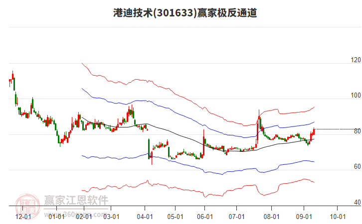 依據(jù)贏家江恩系統(tǒng)趨勢(shì)工具極反通道分析判斷港迪技術(shù)301633運(yùn)行在生命線以下弱勢(shì)區(qū)域,根據(jù)規(guī)則該股短線輕倉(cāng)參與,股價(jià)跌至弱勢(shì)外軌線后波段再結(jié)合其它工具信號(hào)建倉(cāng)。應(yīng)用口訣是:生命線上強(qiáng)勢(shì)走,生命線下難抬頭;紅黃兩條外軌線,壓力支撐顯勢(shì)頭。
