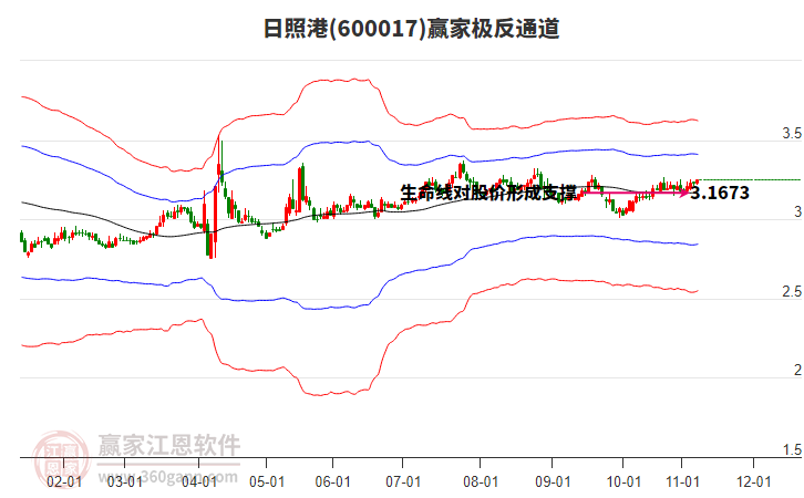 依據(jù)贏家江恩系統(tǒng)趨勢工具極反通道分析判斷日照港600017運行在生命線以下弱勢區(qū)域,根據(jù)規(guī)則該股短線輕倉參與,股價跌至弱勢外軌線后波段再結合其它工具信號建倉。應用口訣是:生命線上強勢走,生命線下難抬頭;紅黃兩條外軌線,壓力支撐顯勢頭。